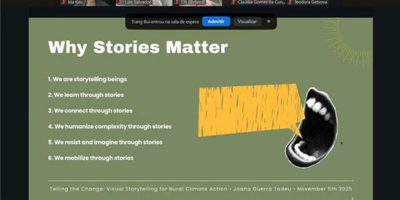 The workshop introduced visual storytelling as a powerful catalyst for environmental and social mobilisation. Through an accessible and interactive format, participants explored how personal and community stories can drive real impact both online and offline. The workshop was grounded in participatory pedagogy, encouraging peer learning, critical reflection, and the co-creation of narratives rooted in real-life experiences. The session covered key elements of effective storytelling: how to structure compelling narratives, understand audiences, build emotional resonance, and adapt messages to digital platforms. Real examples of impactful campaigns were presented to illustrate how rural voices, when shared with intention and creativity, can meaningfully shape climate conversations.